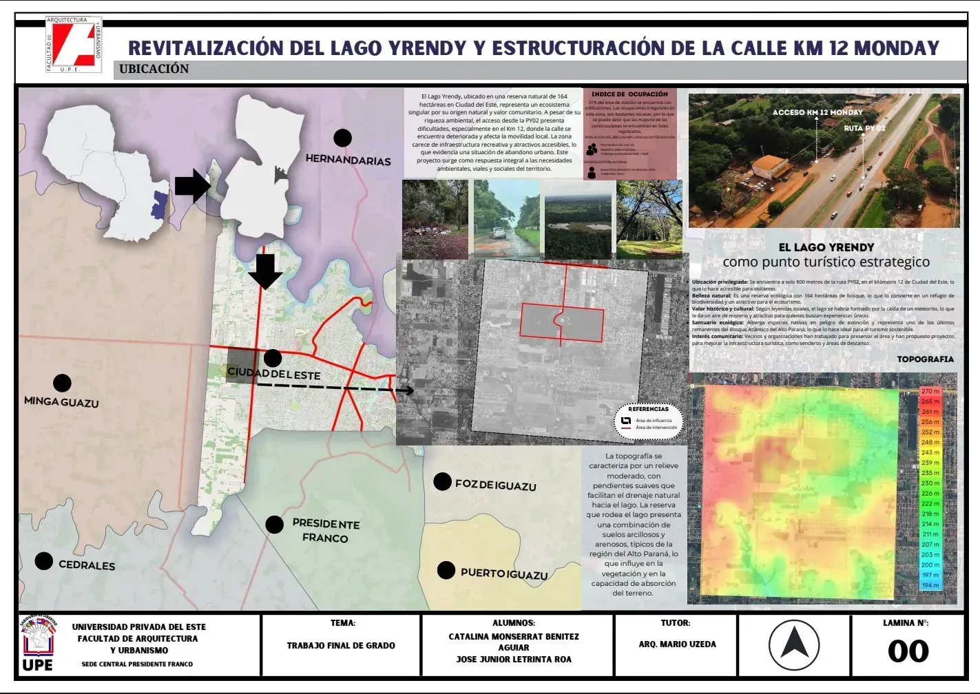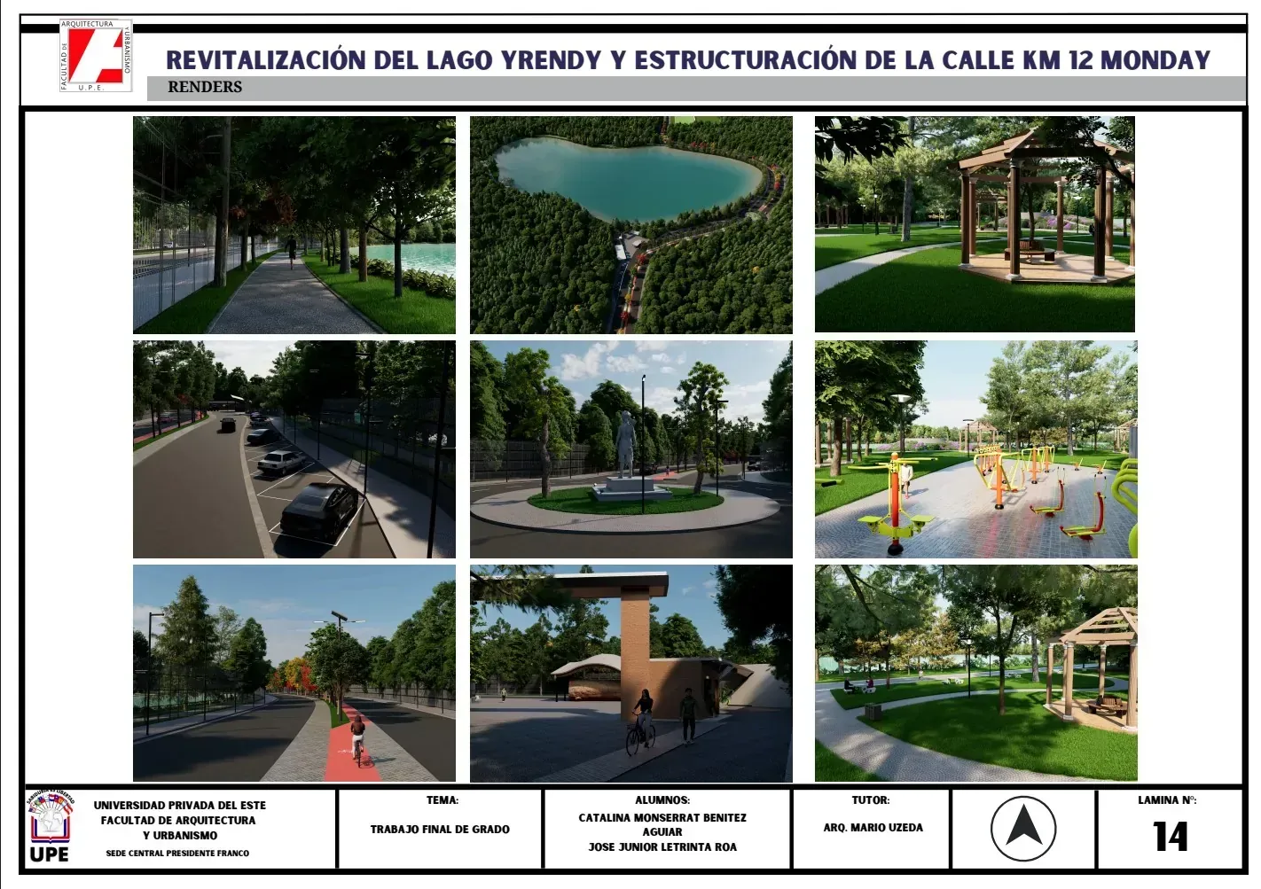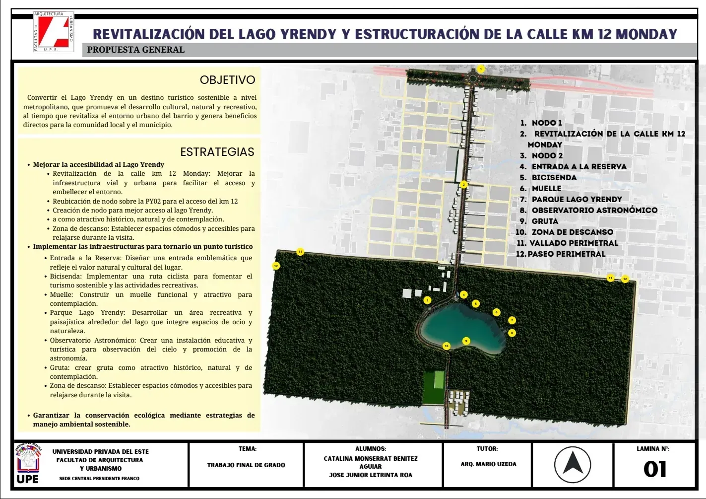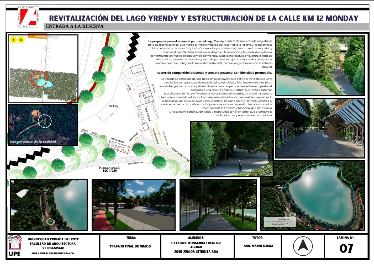 El proyecto aborda de forma integral la revitalización del Lago Yrendy y la estructuración de la calle Km 12 Monday, reconociendo el territorio como un espacio cargado de relaciones, memorias y potencial. Mediante un enfoque interdisciplinario, se plantean soluciones técnicas, legales y ecológicas que responden a las necesidades ambientales y urbanas, fortaleciendo el vínculo comunitario.