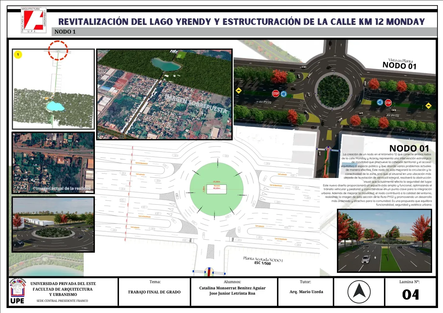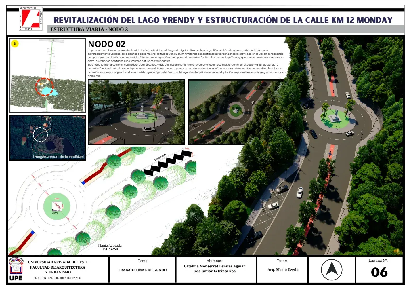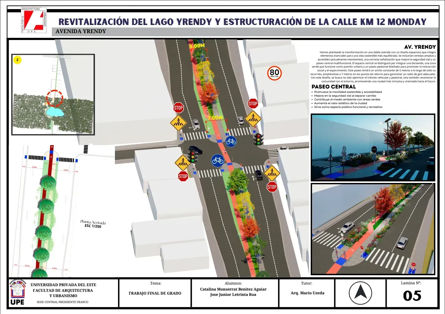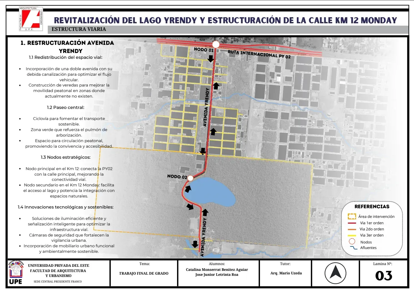 El proyecto aborda de forma integral la revitalización del Lago Yrendy y la estructuración de la calle Km 12 Monday, reconociendo el territorio como un espacio cargado de relaciones, memorias y potencial. Mediante un enfoque interdisciplinario, se plantean soluciones técnicas, legales y ecológicas que responden a las necesidades ambientales y urbanas, fortaleciendo el vínculo comunitario.