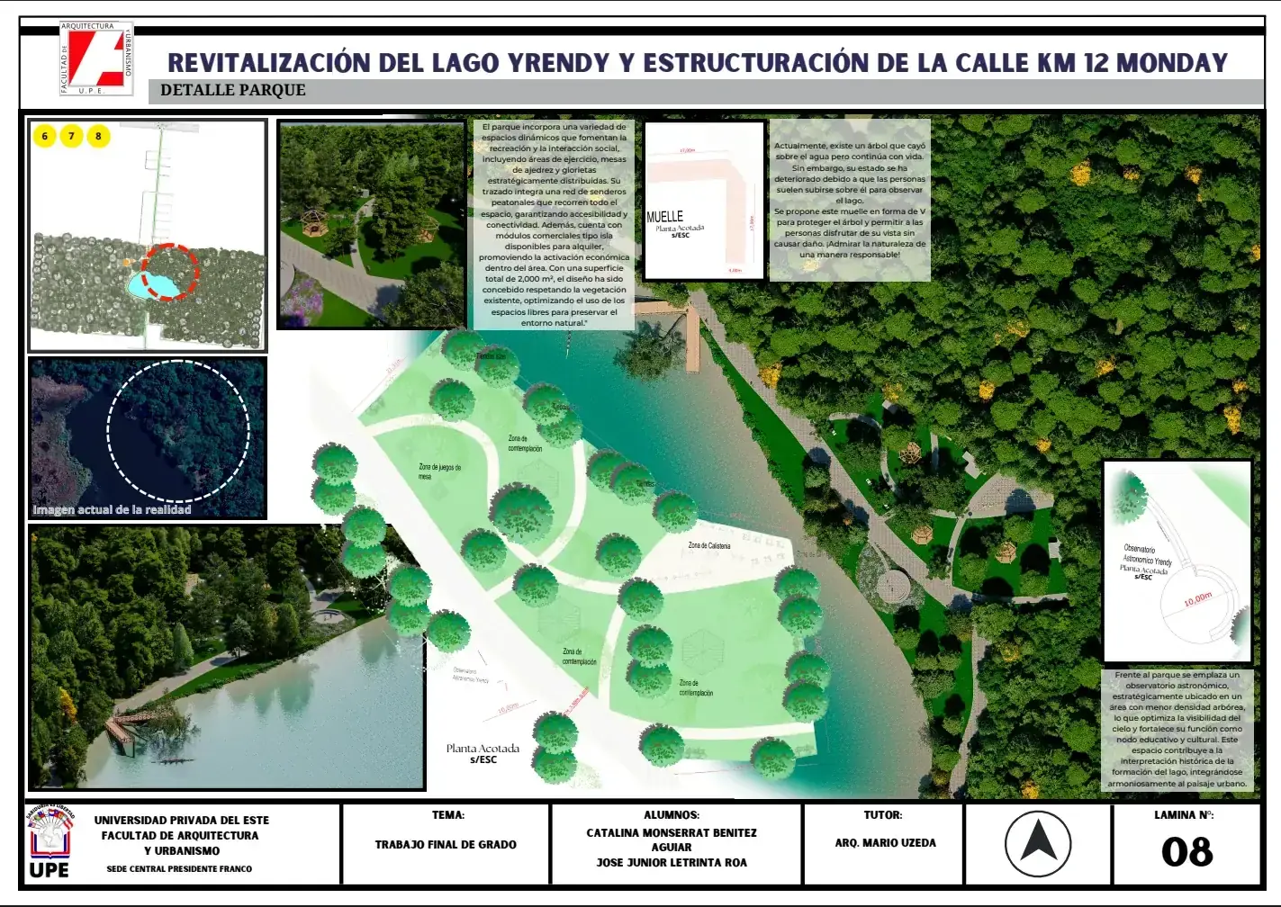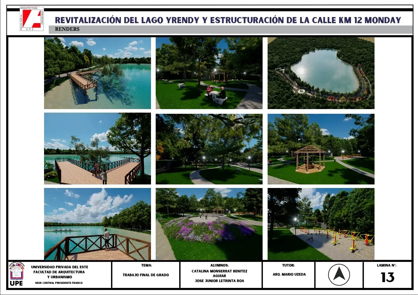El proyecto aborda de forma integral la revitalización del Lago Yrendy y la estructuración de la calle Km 12 Monday, reconociendo el territorio como un espacio cargado de relaciones, memorias y potencial. Mediante un enfoque interdisciplinario, se plantean soluciones técnicas, legales y ecológicas que responden a las necesidades ambientales y urbanas, fortaleciendo el vínculo comunitario.